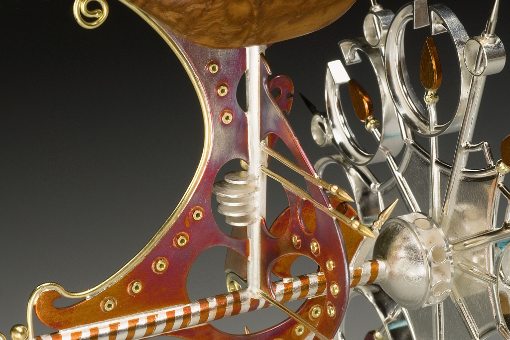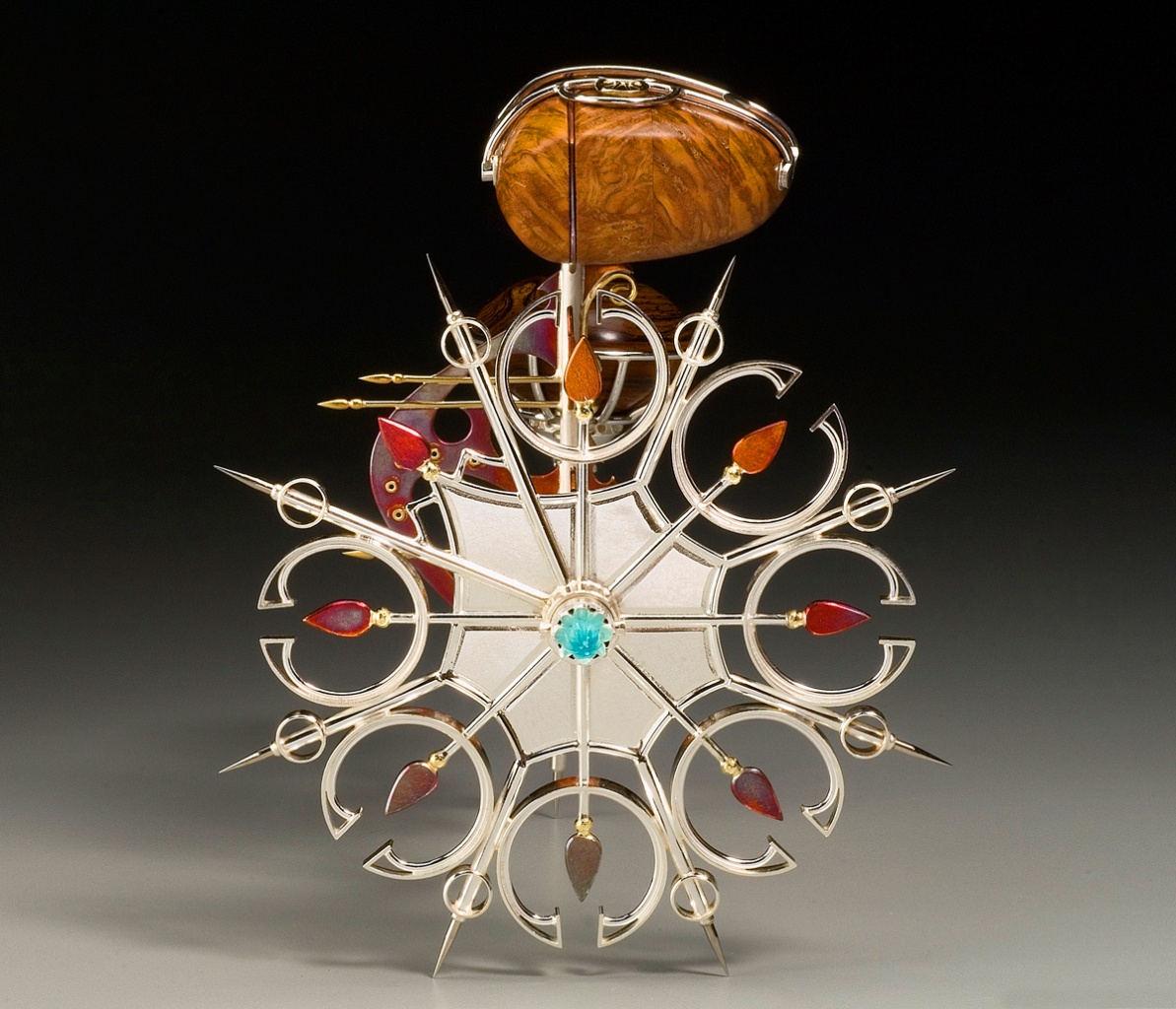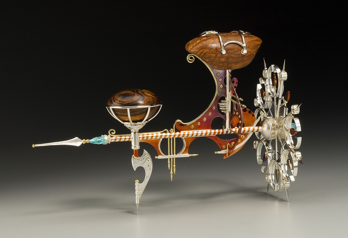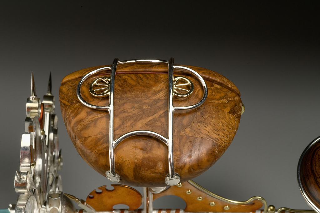 This compass-like tool once resided in a densely packed workshop filled with splendid contraptions and scientific oddities. The shorter handle allows the user to secure the implement in place while the taller handle facilitates the rotary movement of the wheel around the pivot point.