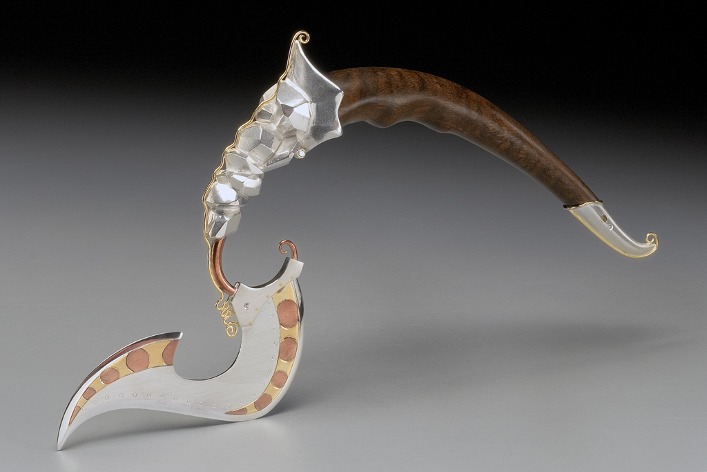 Borealis Blade. Silver, gold, copper, black mulga wood, diamonds. 6H x 10W x 1.5D in.