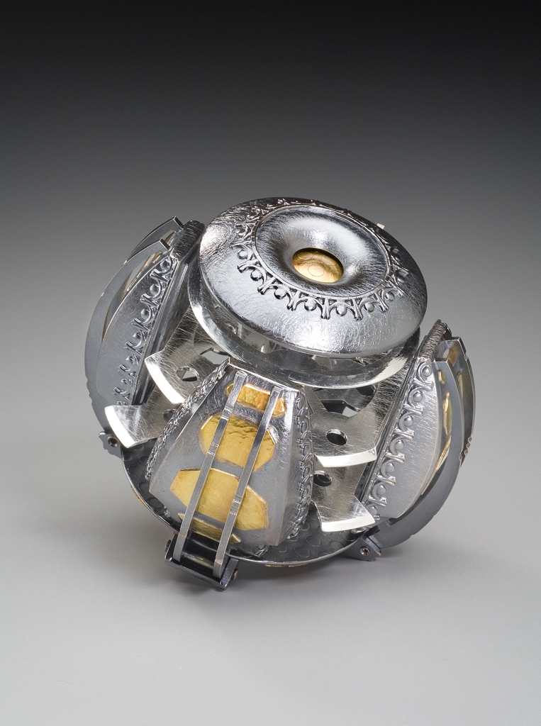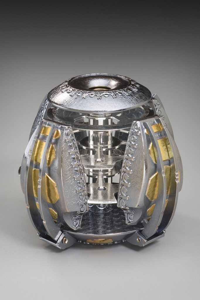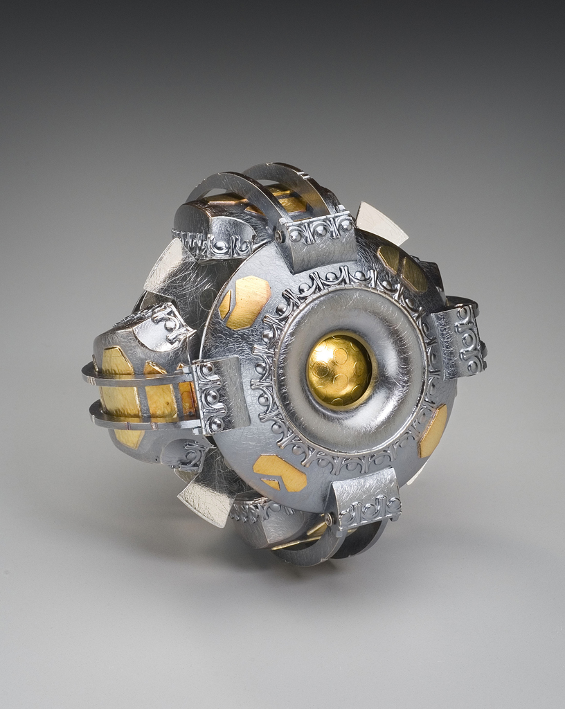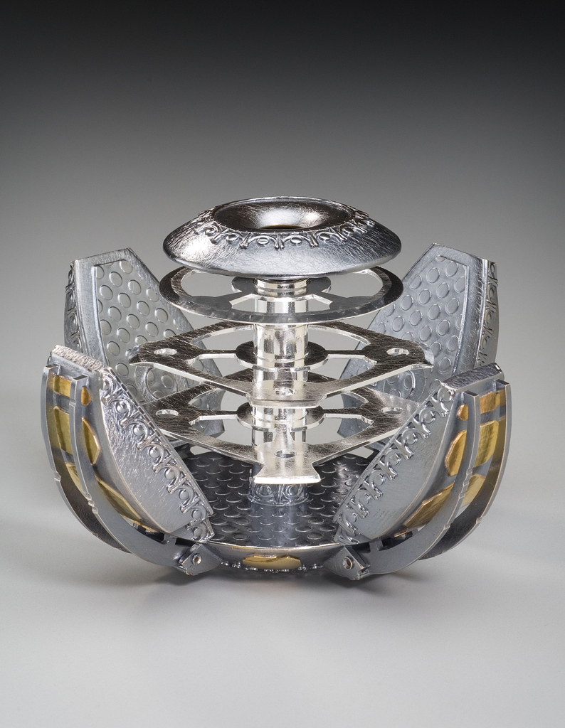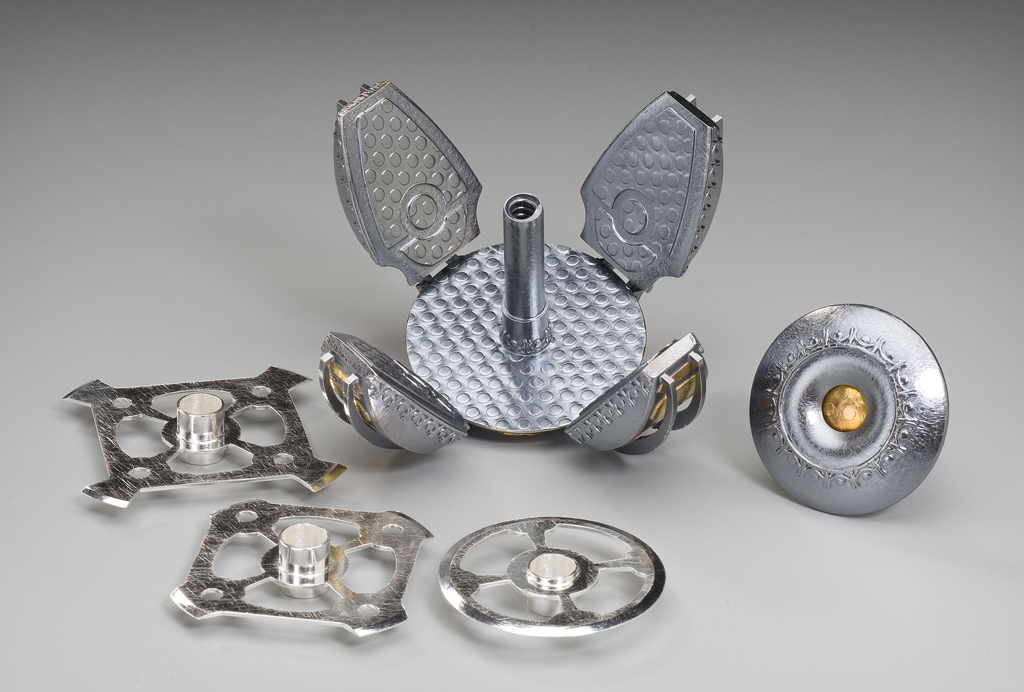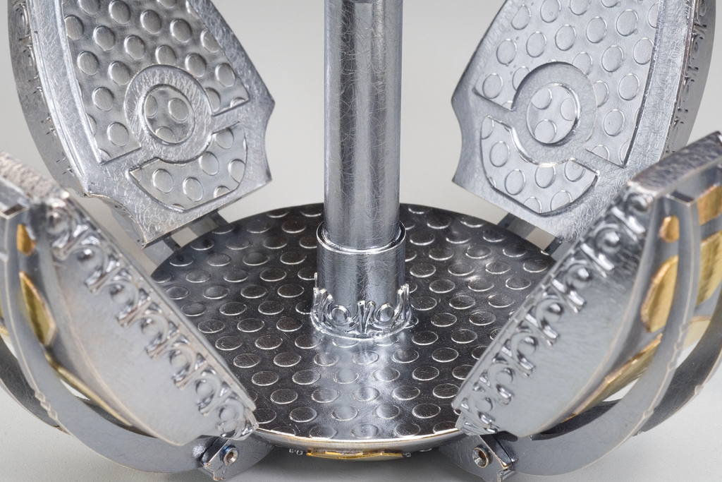 These inhabitants left their local star system, venturing out to become a spacefaring civilization. Their objects reflect their new, industrial environment, drawing inspiration from the steel girders and embossed deck plating of their surroundings. The four contractor arms secure the blades from the side while the small dome on top locks them down with a threaded bolt.