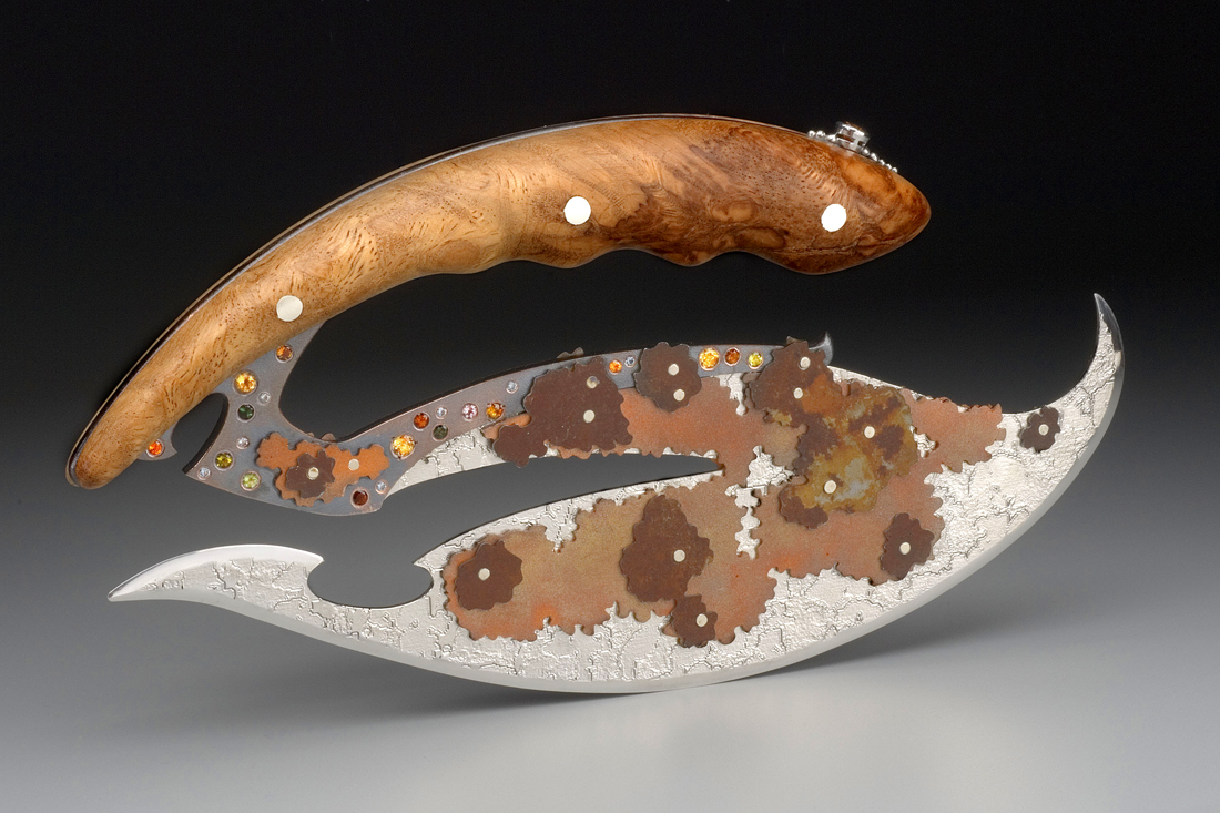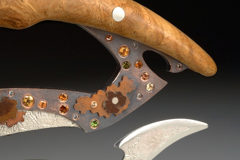 Moss Cutter. Silver, copper, steel, afzelia xylay burl wood, garnet, citrine, zircon, tourmaline. 4.75H x 8.5W x 1.5D in.