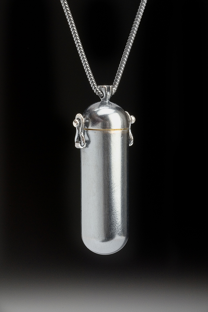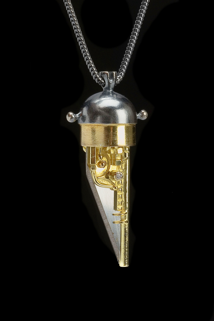 When closed this knife attracts little attention, but its uncomplicated and discreet exterior conceals a prized and useful tool. I wanted this piece to have a sterile, even industrial feel on the outside, more fitting of a male wearer, while leaving the inside with an air of secrecy.
