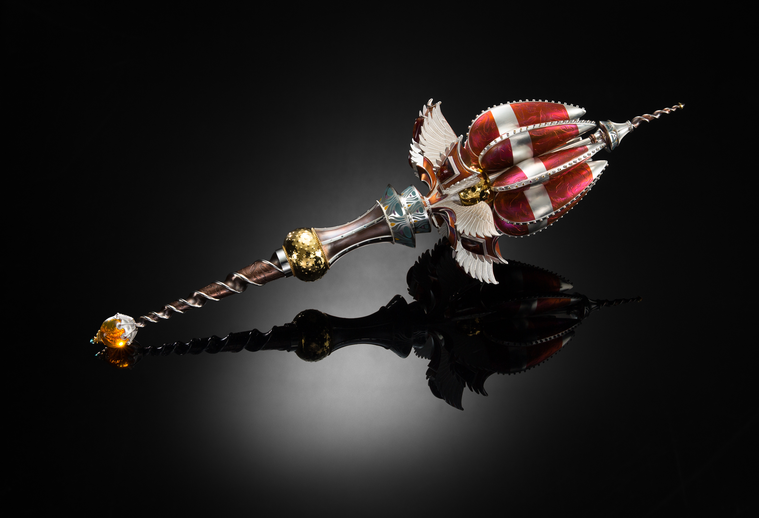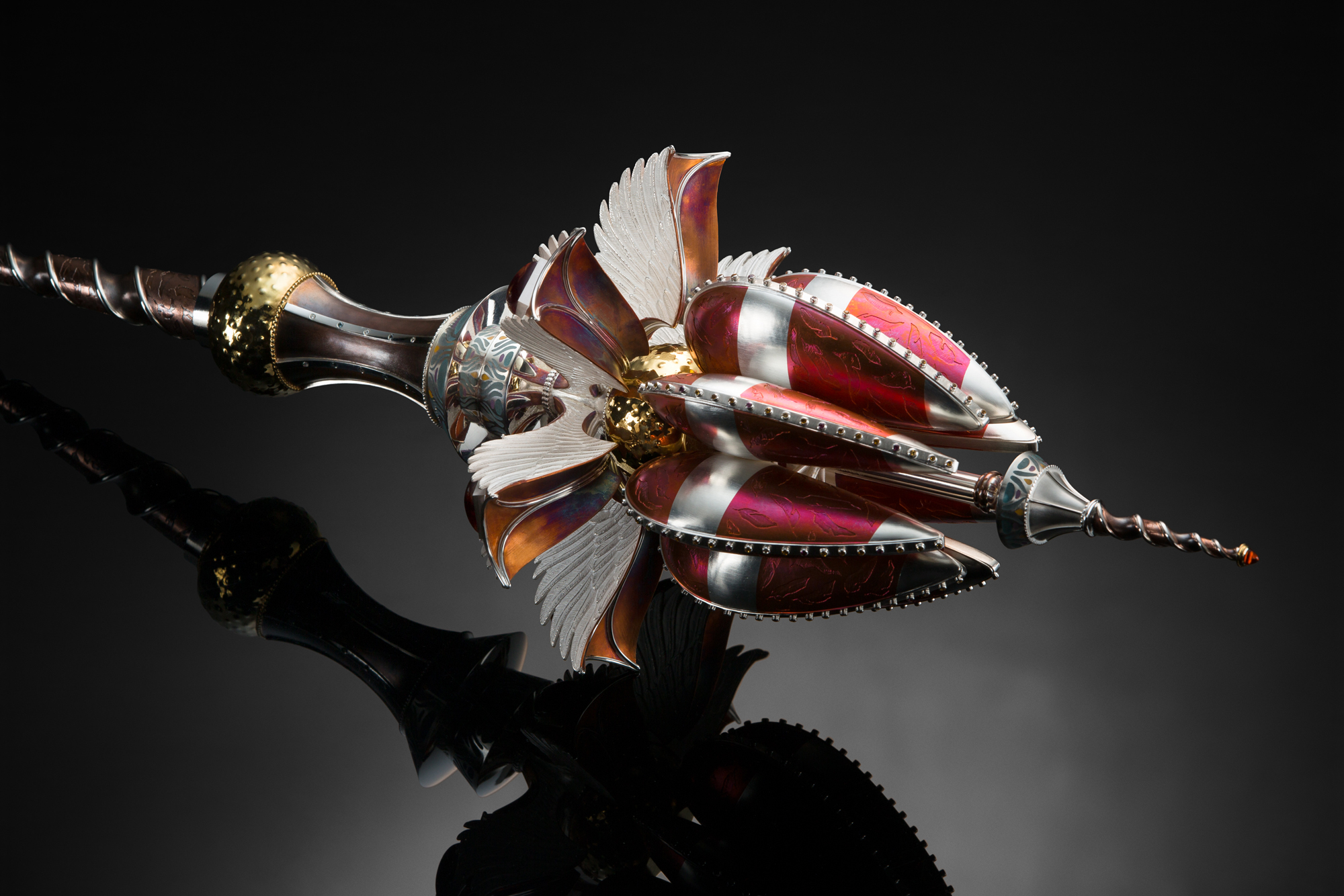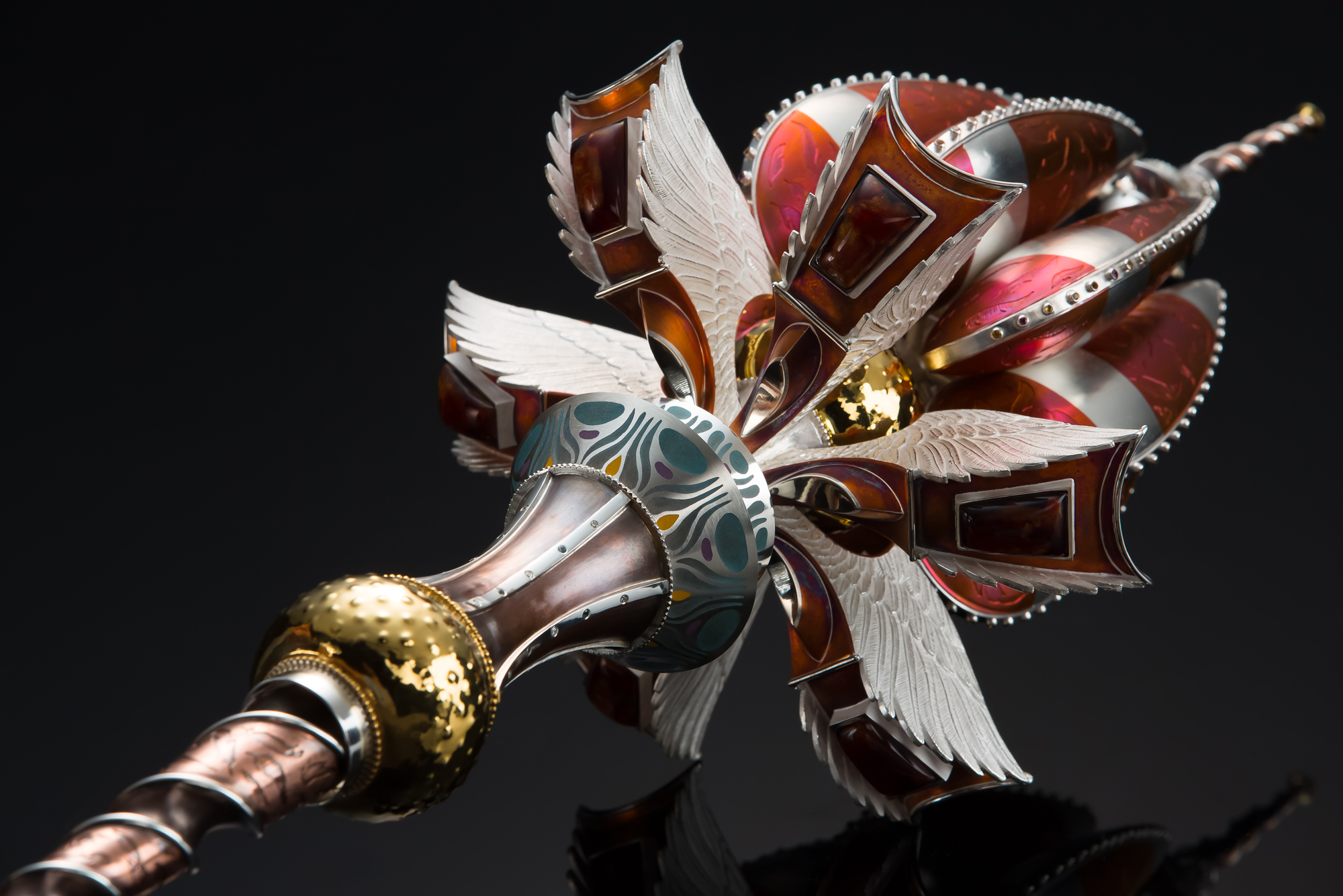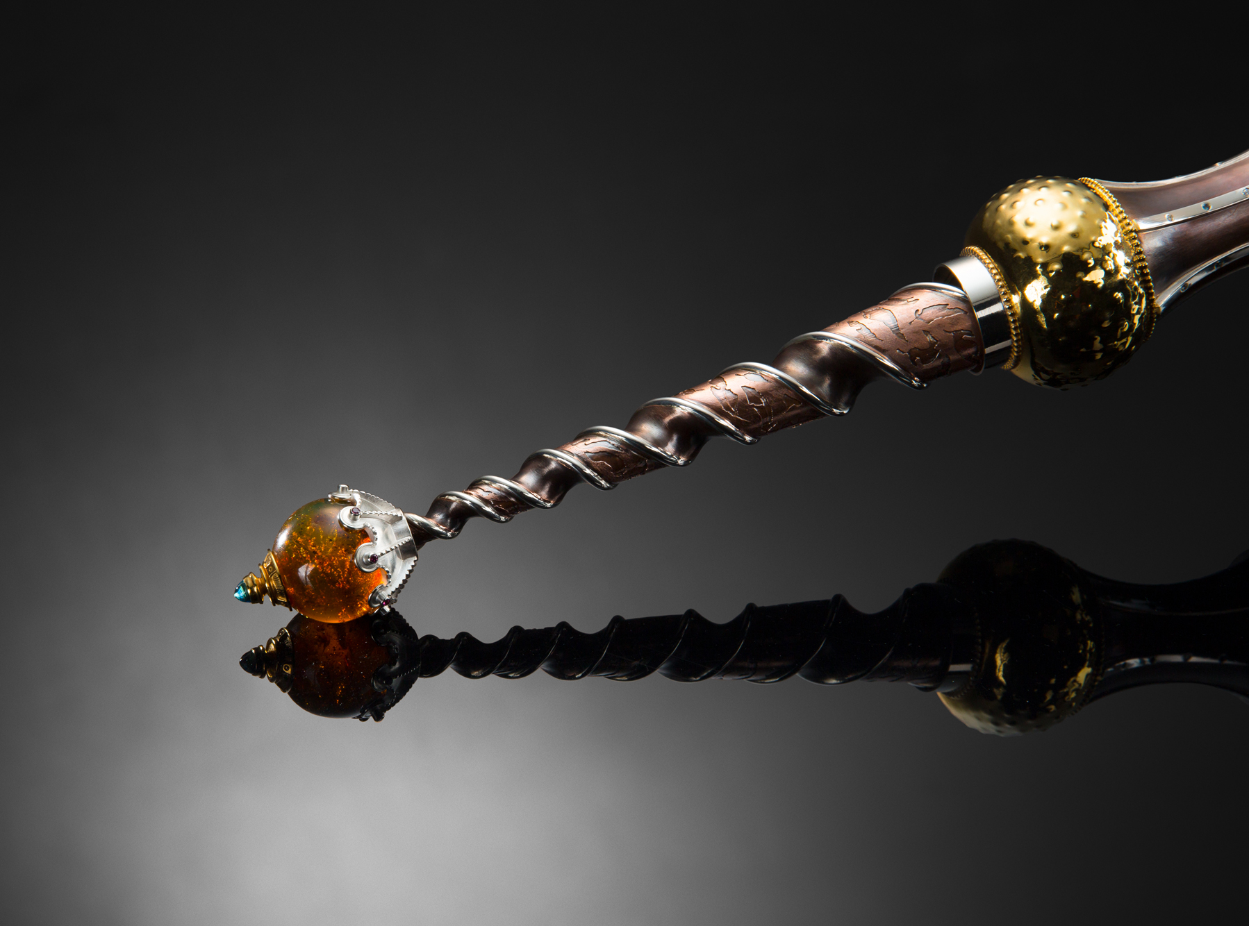 The preliminary design drawings were started in 2011. Work continued for roughly four years and the construction was finally completed in 2015. The Mace "stands" approximately 23 inches tall by 7 inches wide and is carefully crafted from pure silver, 24k gold plating over sterling, hammered copper, inlayed resin, hand carved Italian acetate and set with over 130 precious gems, some of which include, white diamonds and a 30mm amber sphere from the Dominican Republic. It illustrates my passion for the ornate and my love for making meticulously crafted, fine art objects. (Photo credit: Drew Gilbert and Jon Reece, except construction shot. Saul Bell Award photo credit to Rio Grande).