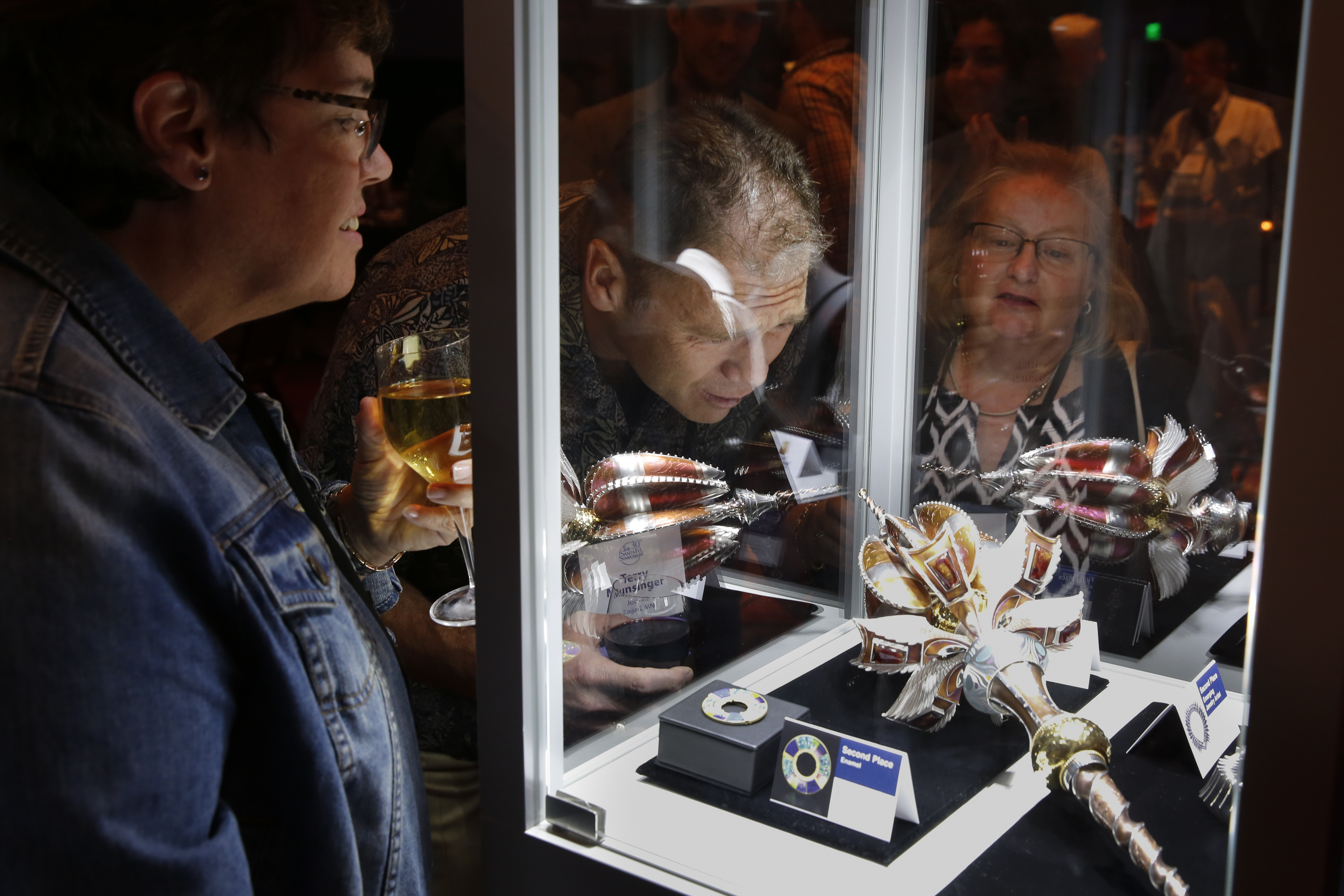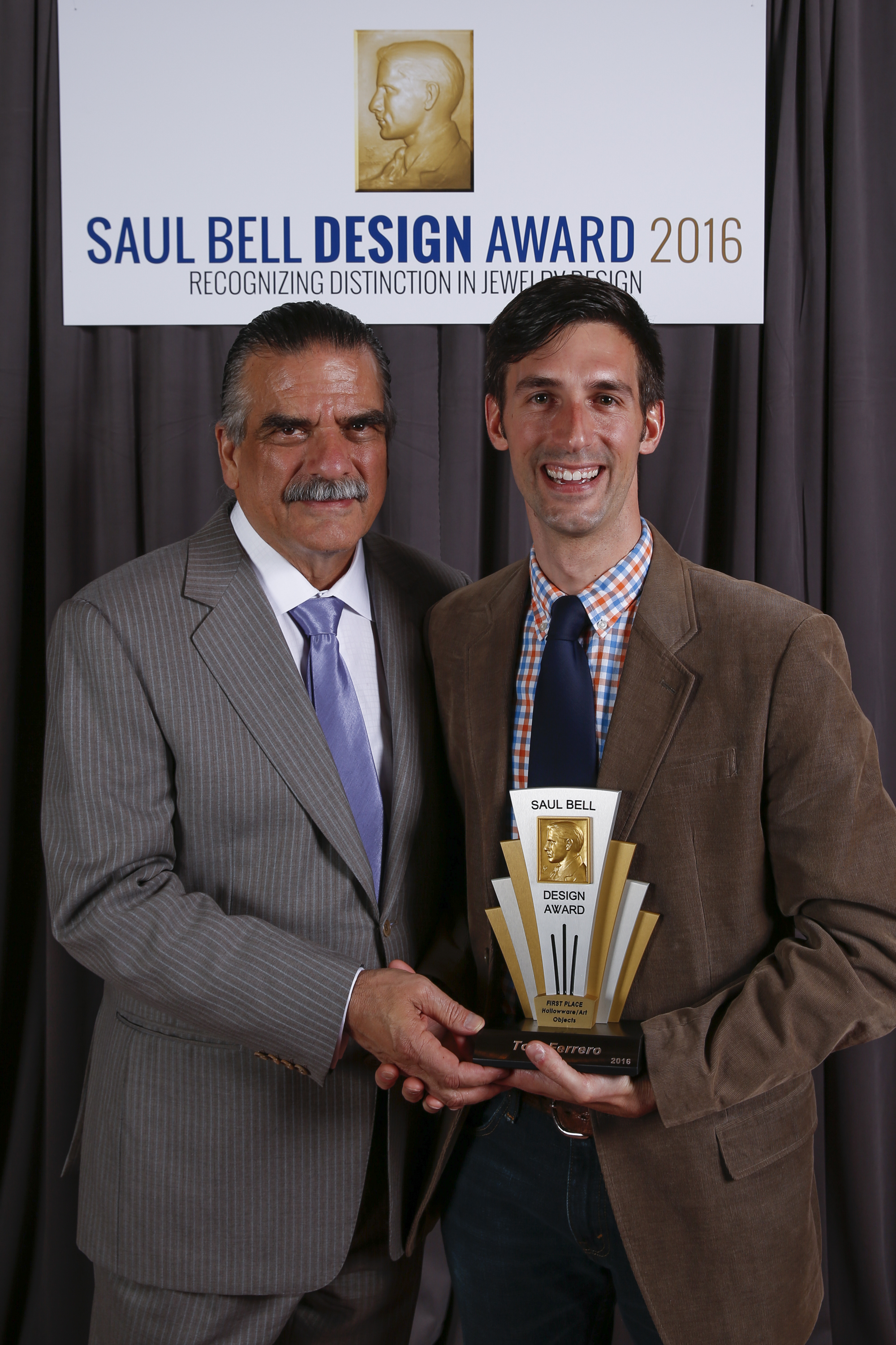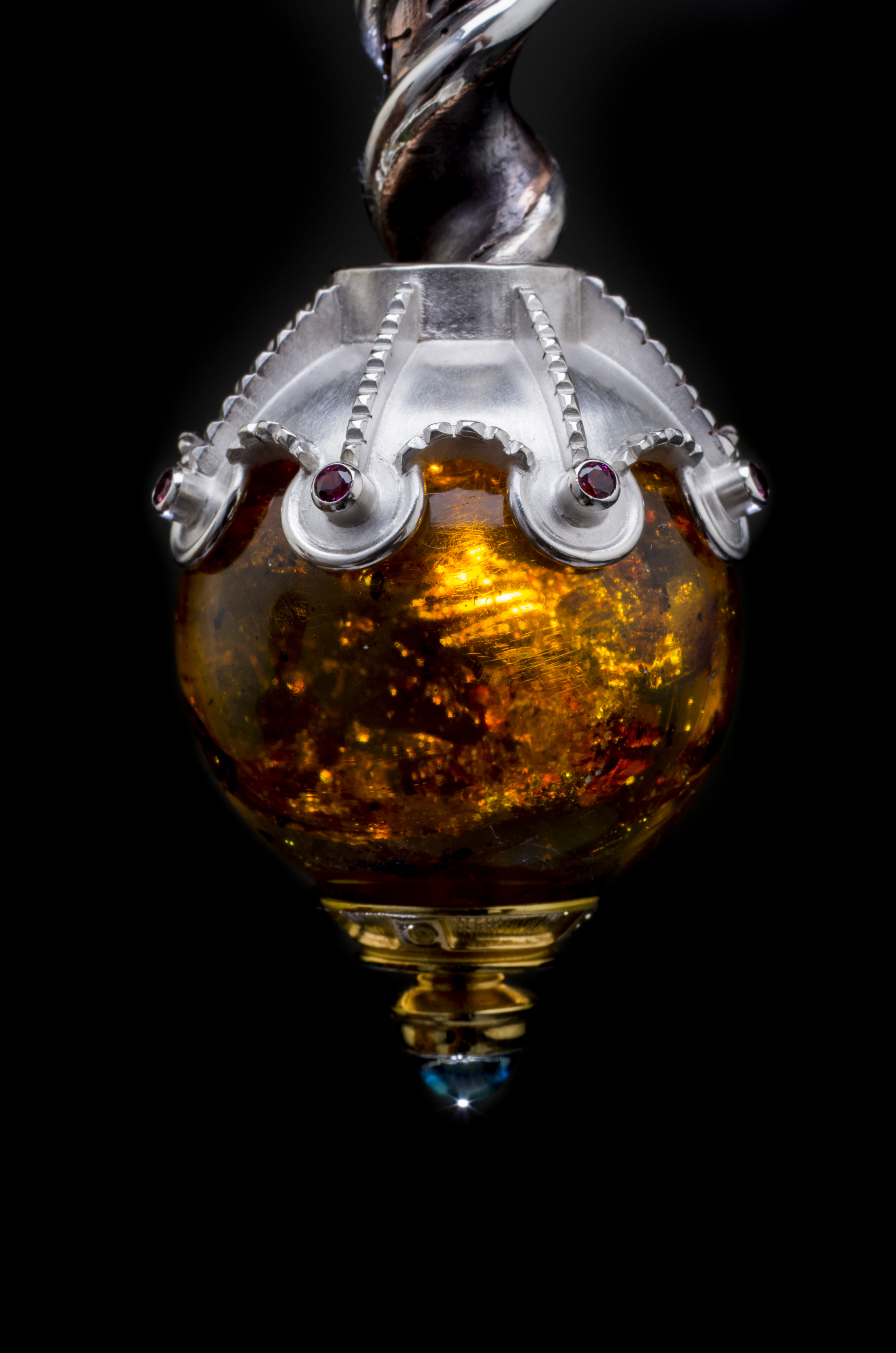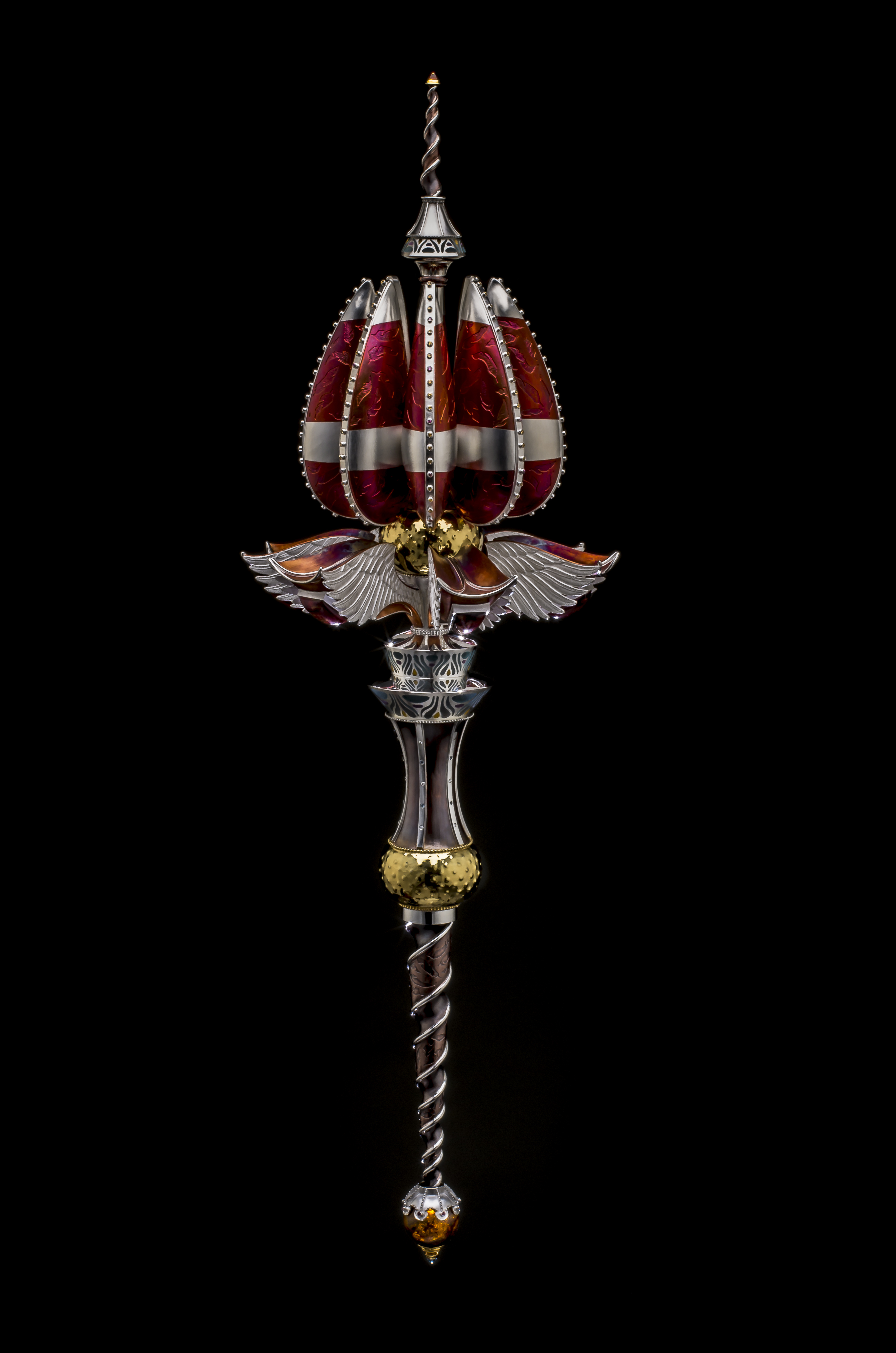 The preliminary design drawings were started in 2011. Work continued for roughly four years and the construction was finally completed in 2015. The Mace "stands" approximately 23 inches tall by 7 inches wide and is carefully crafted from pure silver, 24k gold plating over sterling, hammered copper, inlayed resin, hand carved Italian acetate and set with over 130 precious gems, some of which include, white diamonds and a 30mm amber sphere from the Dominican Republic. It illustrates my passion for the ornate and my love for making meticulously crafted, fine art objects. (Photo credit: Drew Gilbert and Jon Reece, except construction shot. Saul Bell Award photo credit to Rio Grande).