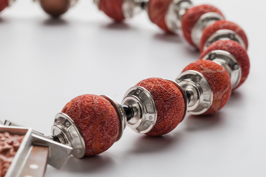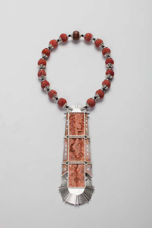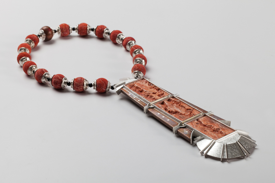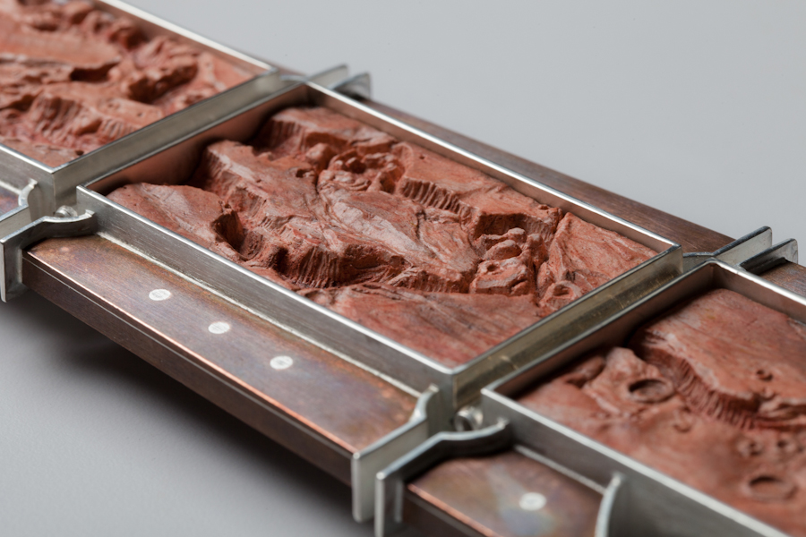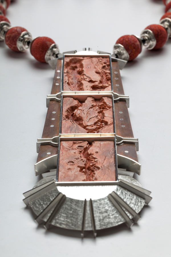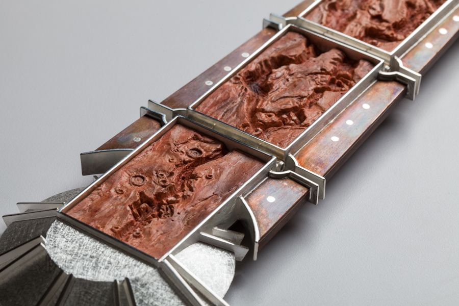 The Mars Series (still in progress) explores scientifically significant and aesthetically interesting landscapes and topographical features on the planet Mars. I'm interested in promoting current discoveries in space exploration and astrophysics through the vehicle of fine art jewelry and hope to reach new audiences through this cross-disciplinary adventure. Currently, the work is comprised of large sculptural necklaces with forms that allude to space shuttle, satellite and rocket components. These structures then house carved cameos of the Martian landscape referenced from orbital imagery maps.