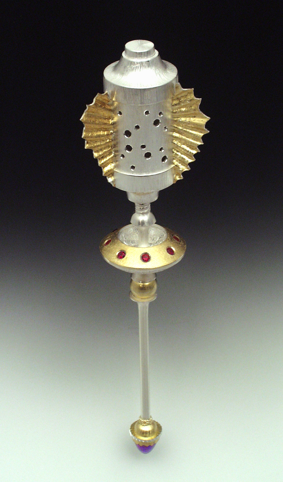 The Virgin Tea Infuser. Sterling silver, 22k gold, pyrope garnet, amethyst.