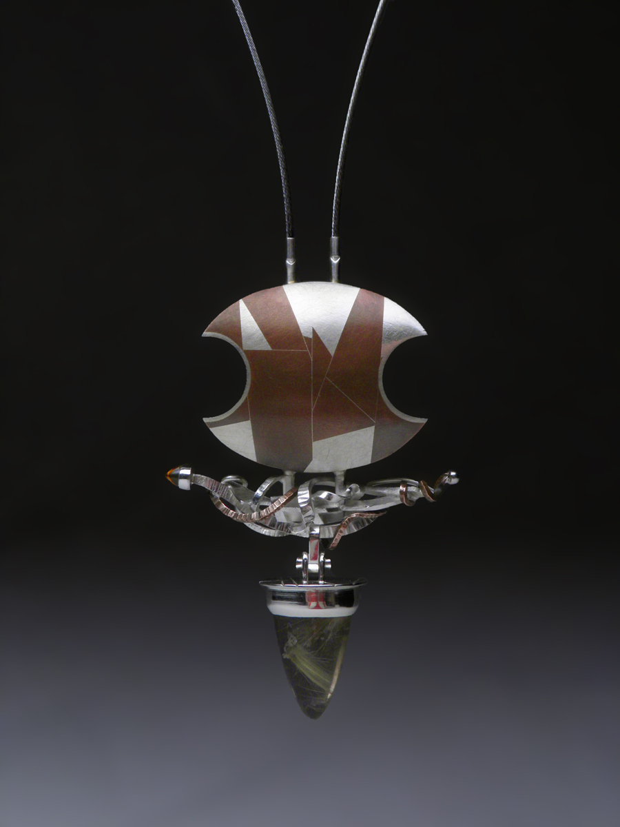 "Fractured" Pendant - Sterling silver, copper, steel, peridot, citrine, rutilated quartz