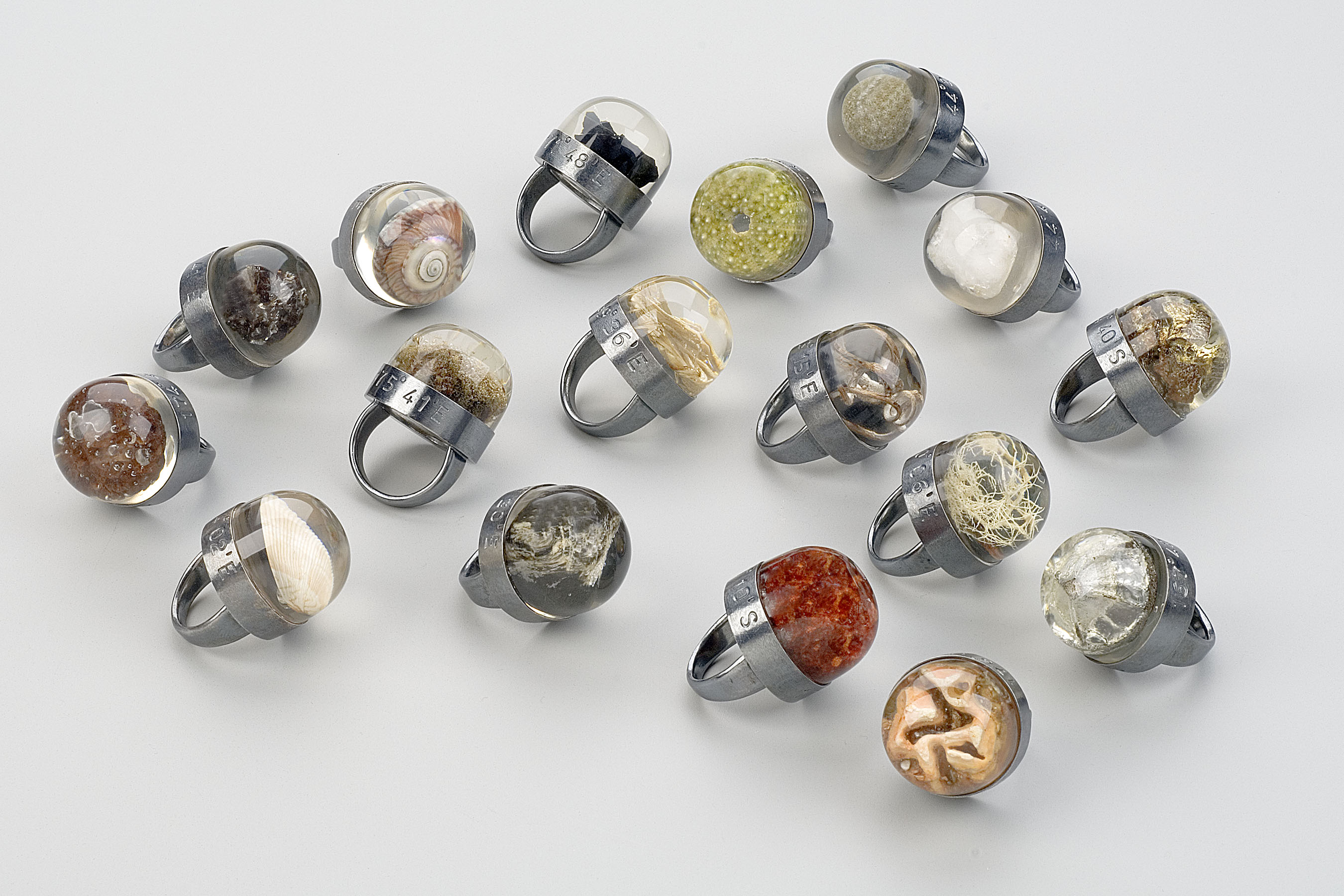 New Zealand Journal Rings, Silver, resin, assorted found objects from New Zealand